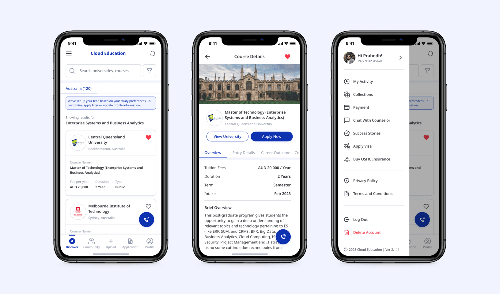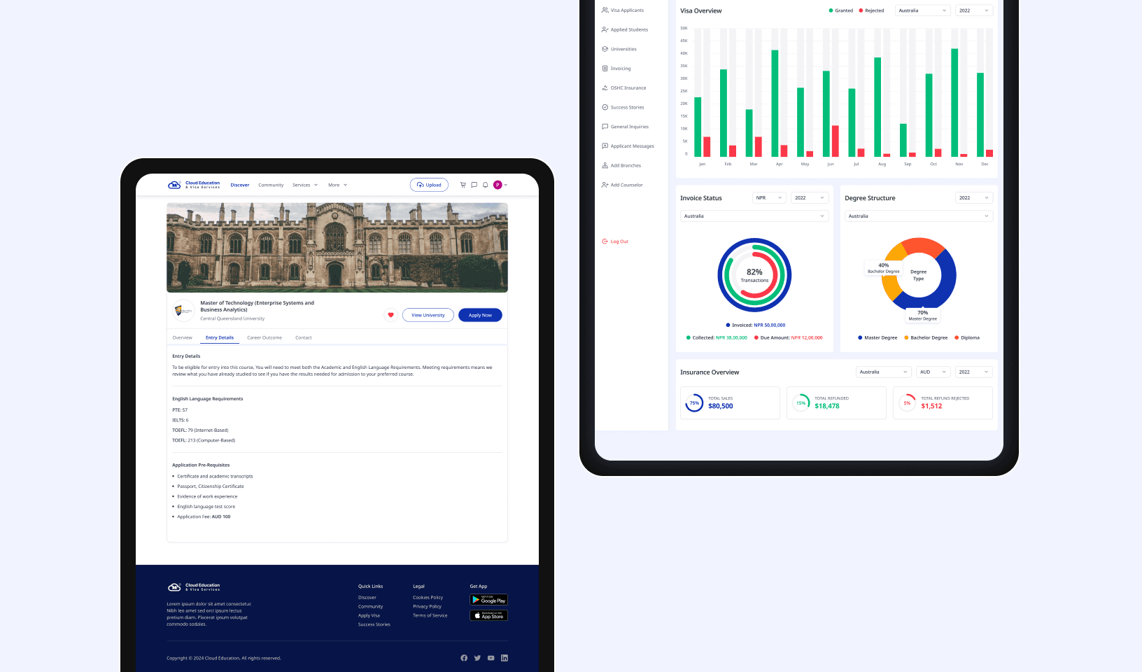Cloud Education and Visa Services is an mobile and web platform that revolutionizes the process of managing and processing student visa applications for higher education in countries such as Canada, USA, Australia and many more. Spanning a period of 8 months, this project brought together a diverse team of experts to ensure a comprehensive solution that caters to both students and administrators.